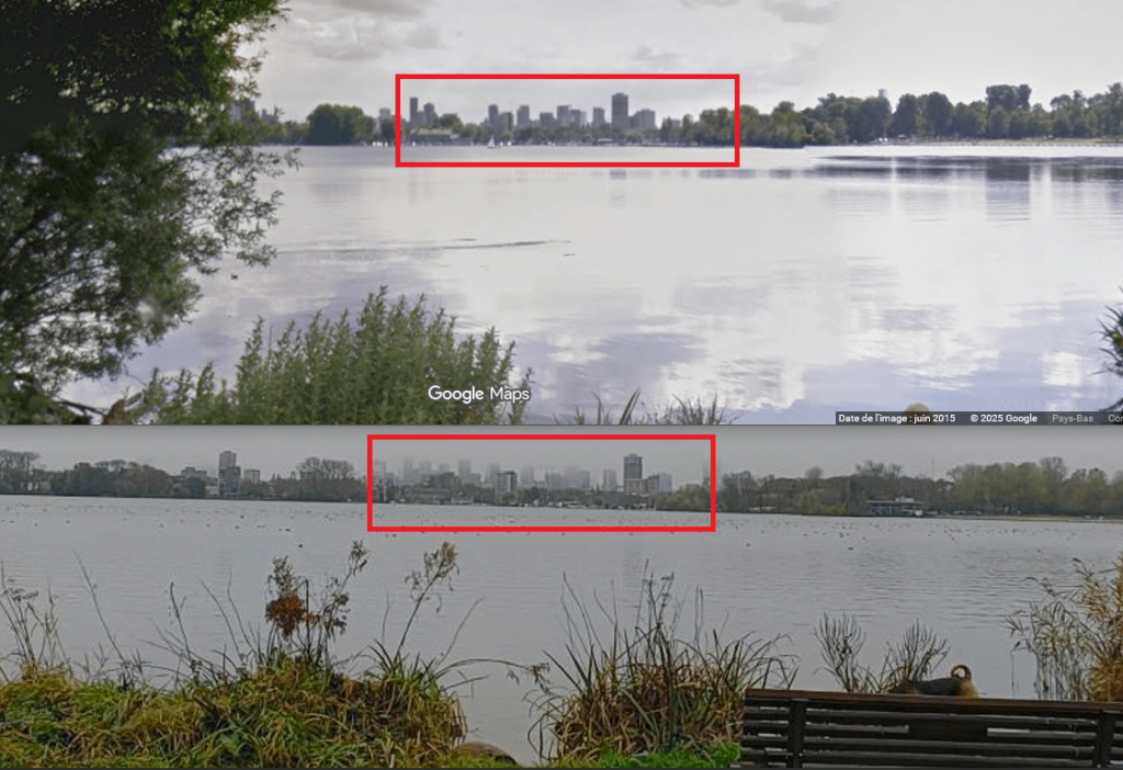 Des recherches croisées ont été menées à partir de plusieurs sources ouvertes pour identifier le lac en question et sa localisation. L’image montre un lac, un banc, un ponton et, en arrière-plan, des bâtiments. Après avoir examiné les métadonnées de la photo sans résultats concluants, l’analyse s’est concentrée sur les indices visuels. Aucune recherche inversée n’a permis de fournir des informations supplémentaires. (Google Images , Yandex)