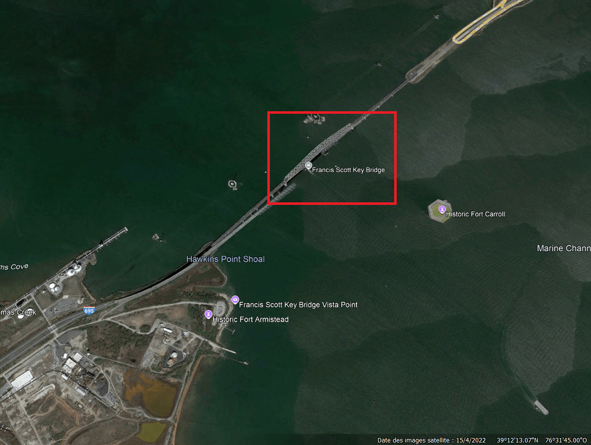 L’image satellite disponible dans Google Earth Pro ( prise en 2022) confirme la présence du pont »Francis Scott Key Bridge » avant l’accident.
