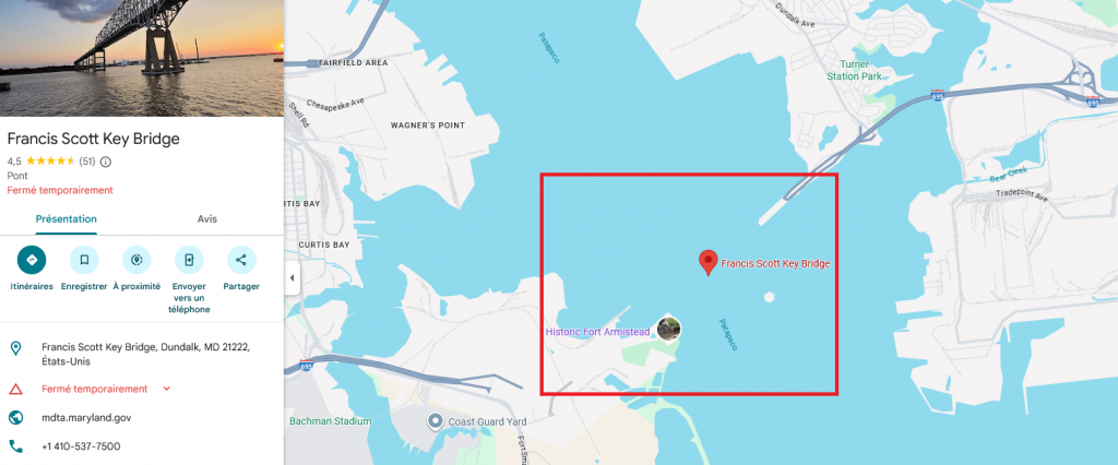 L’examen de Google Maps après le 26/03/2024 montre que le pont »Francis Scott Key Bridge » n’apparaît plus, confirmant visuellement son effondrement.
